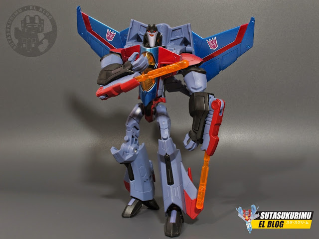 Es en el modo alterno es donde mejor queda el esquema de colores estilo G1, porque en modo robot los colores quedan desplazados hacia zonas donde el clásico Starscream no los lleva. Una pequeña exigencia de coleccionista: me hubiera gustado que la cabina quedara de color amarillo.